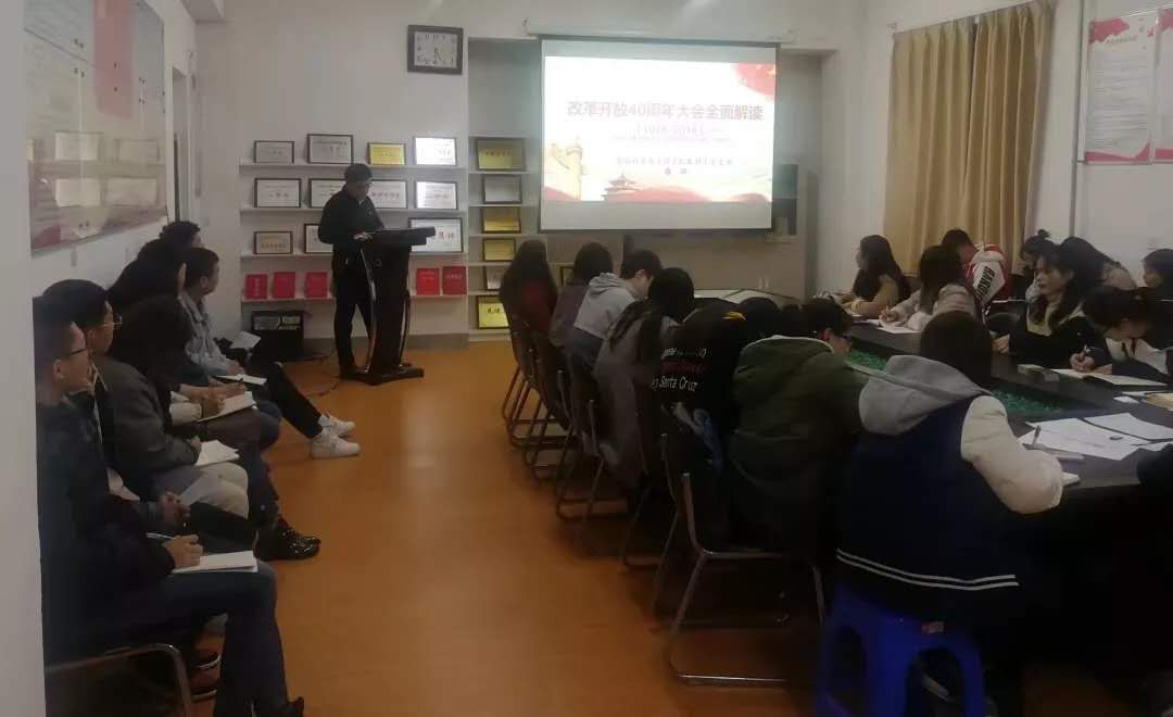 3月20日,本科生支部书记唐珏在党员活动室为支部所有人员上了一堂题为《改革开放40周年大会全面解读》的党课。