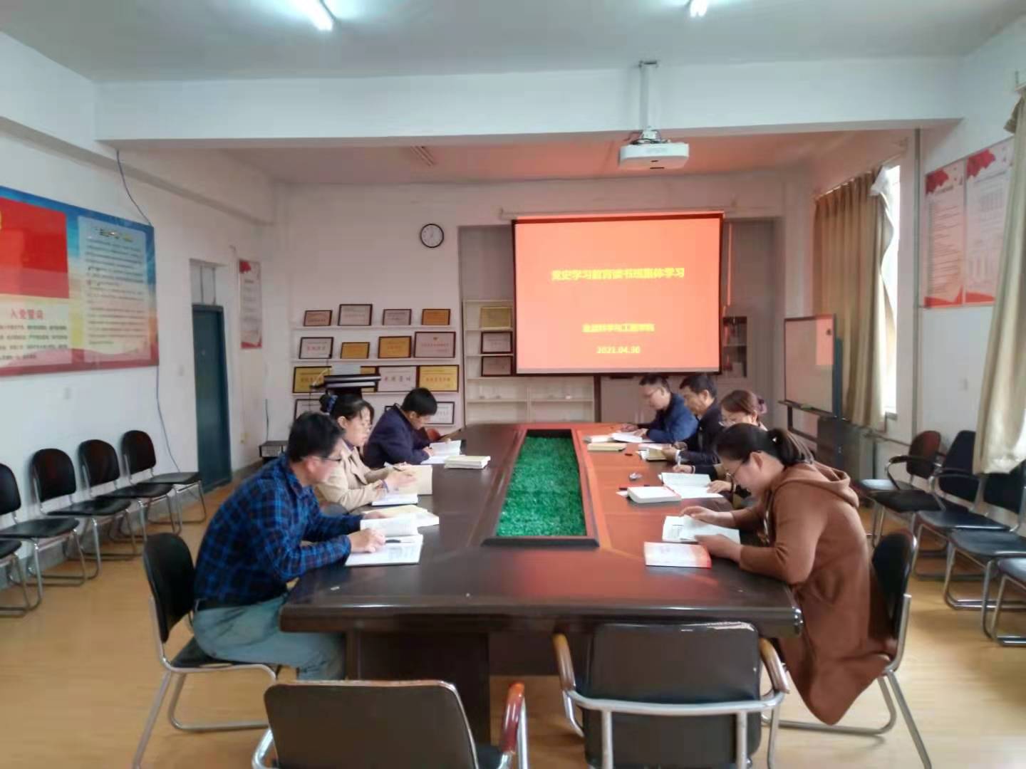 高璐璐带领与会人员重点围绕《论中国共产党历史》《中国共产党简史》通过领读方式学习了在纪念邓小平同志诞辰一百一十周年座谈会上的讲话、继续从延安精神中汲取力量、让井冈山精神放射出新的时代光芒、中华人民共和国的成立和新生人民政权的巩固、社会主义改造的基本完成和社会主义制度的建立、党的八大和中国社会主义建设的良好开端、社会主义建设在曲折中发展等内容。武家春和李莹结合学习和工作实际进行了学习交流。