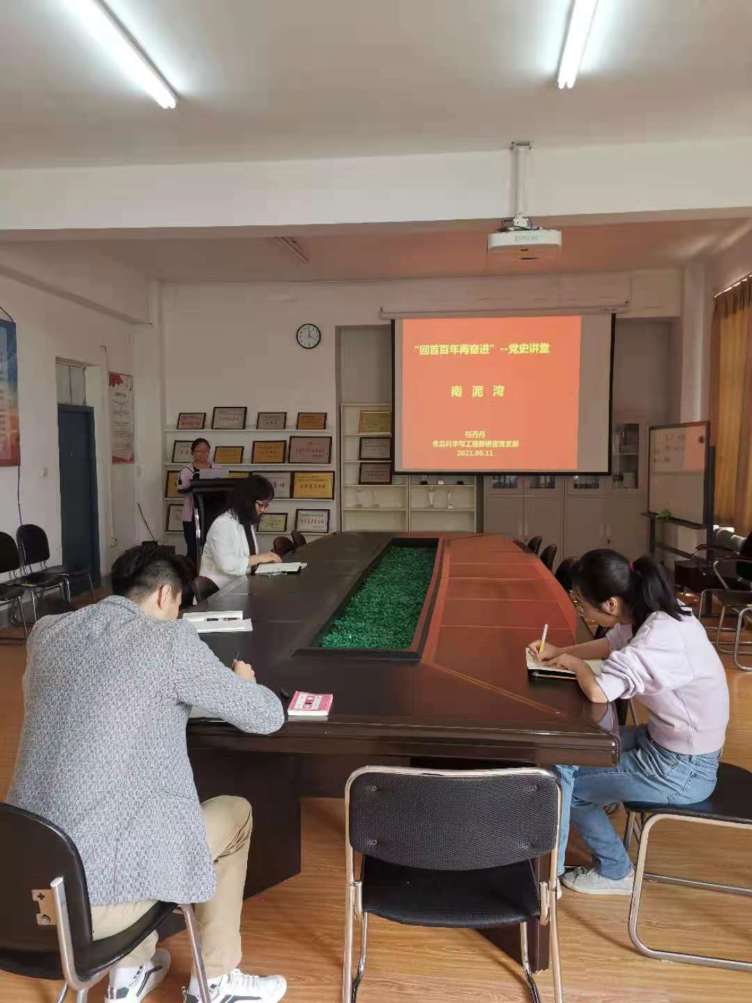 海洋资源开发技术教研室党支部于6月11日开展了“红色诗词学党史系列”专题党课活动。支部书记曲敏以《七律•人民解放军占领南京》为题,为支部全体党员上了一堂生动的党课,她从背景介绍、译文及写作风格、艺术赏析等方面详细讲解了诗词。