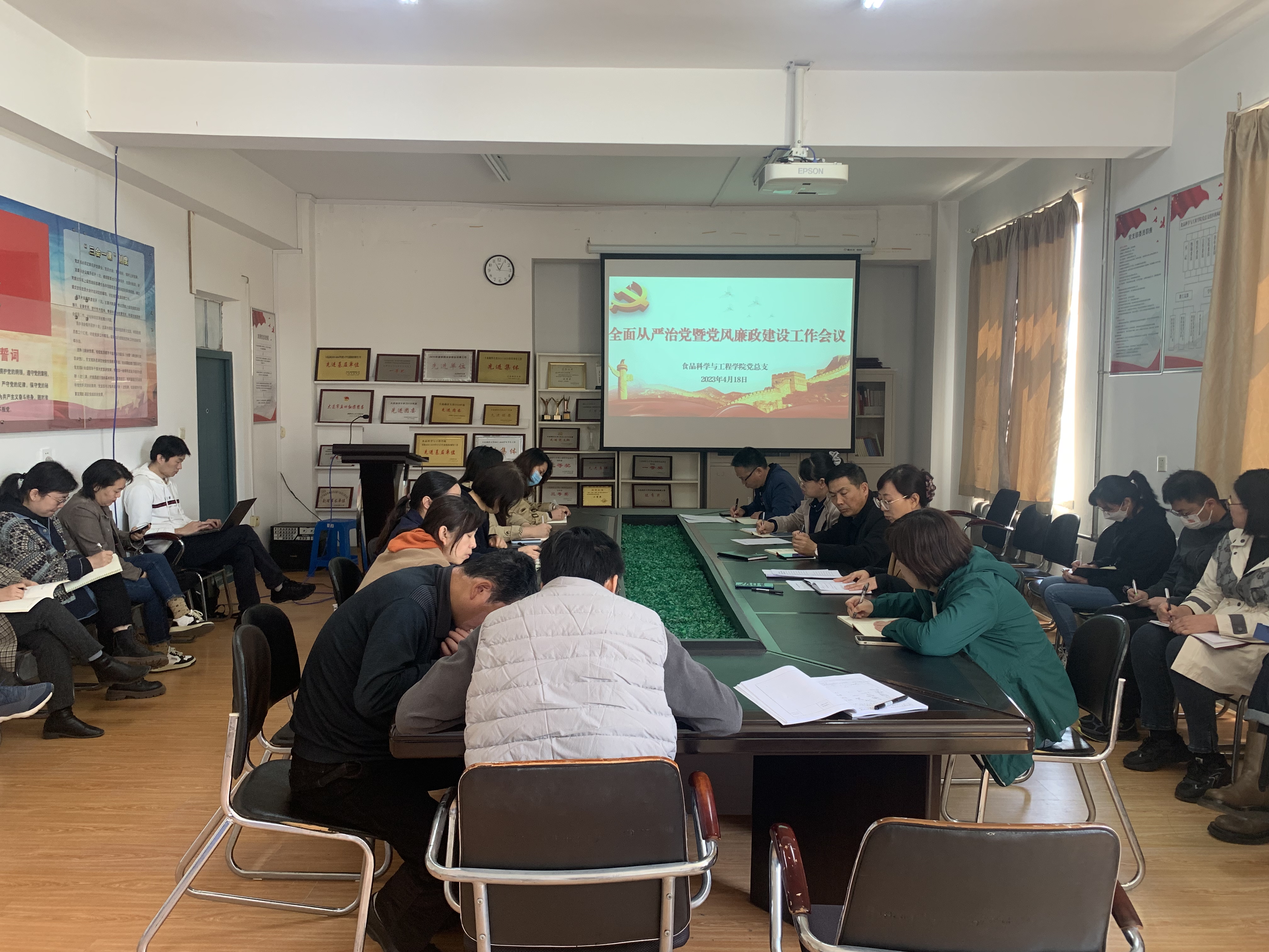 4月17日,williamhill党总支召开2023年度全面从严治党暨党风廉政建设工作会议,学院领导班子成员、科级以上干部、全体教工党员参加会议,会议由总支副书记兼纪检委员武家春主持。