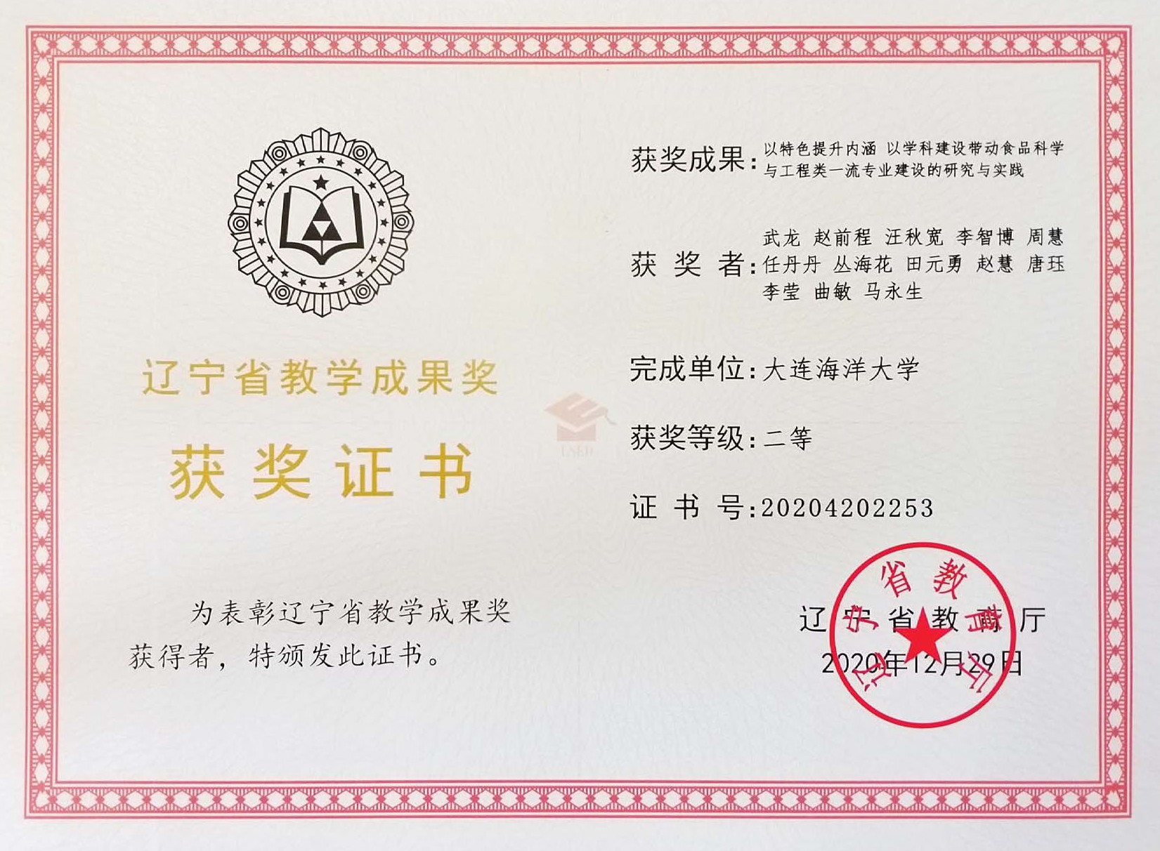 围绕相关课题,本团队以2014年校级重点支持专业建设工程为起点,开展了一系列理论研究与实践探索;公开发表教学研究论文21篇。随着2016版人才培养方案的启用,成果体系于“十三五”期间全面接受实践检验。四年间,涌现出省级虚拟仿真实验教学中心、省级虚拟仿真实验教学项目、省级本科教学成果二等奖、省级教学名师、省级大学生校外实践教育基地、辽宁省一流本科教育示范专业等一批标志性成果。随着改革的深化,立德树人的教育教学氛围日益浓厚,人才培养成果大量涌现,培养质量持续改进,得到学生、教师、学校、同行及社会的广泛认可。食品科学与工程专业于2020年入选“双万计划”首批省级一流本科专业建设点。