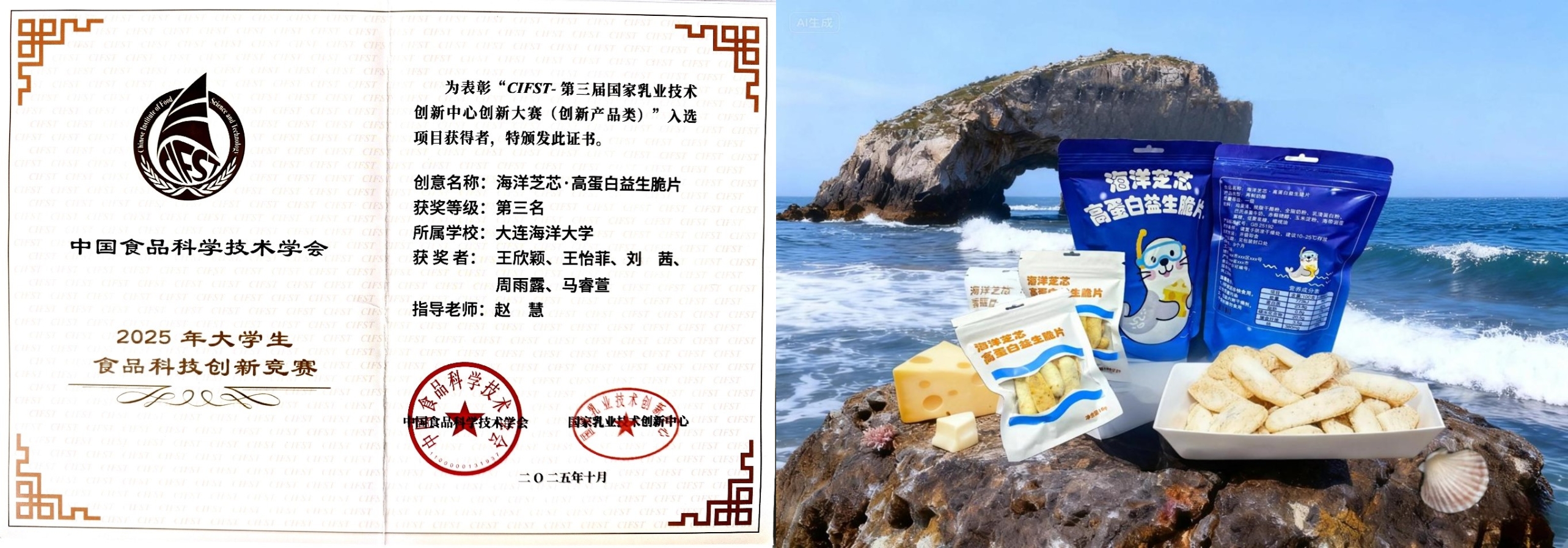 在我院首次参赛的CIFST——第三届国家乳业技术创新中心创新大赛中,由赵慧副教授指导,王欣颖等同学完成的作品“海洋芝芯·高蛋白益生脆片”,发挥在海洋食品资源高值化利用方面的优势,创新性地将海洋蛋白与益生元相结合,成功斩获创意产品类第三名(三等奖)。