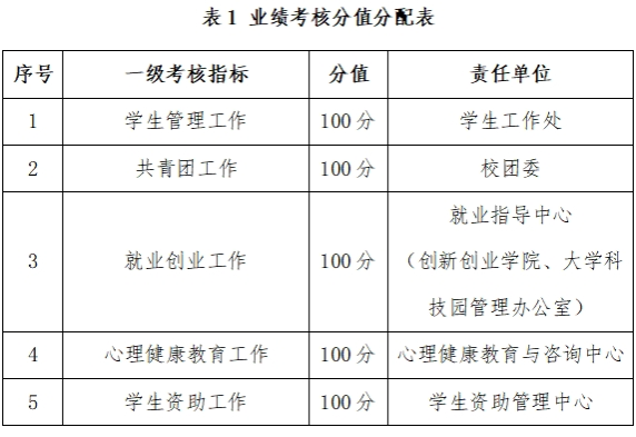 各责任单位分别负责5项一级考核指标的编制和成绩认定,每项满分折合为100分,考核总分为500分。各责任单位根据工作实际要求,分别在一级考核指标下设若干项二级考核指标,并依据各学院(书院)实际工作开展情况,进行成绩认定。一级考核指标分值分配如表1所示: