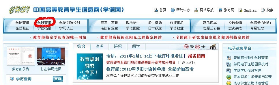 1、登陆中国高等教育学生信息网http://www.chsi.com.cn。点击“学籍查询”。