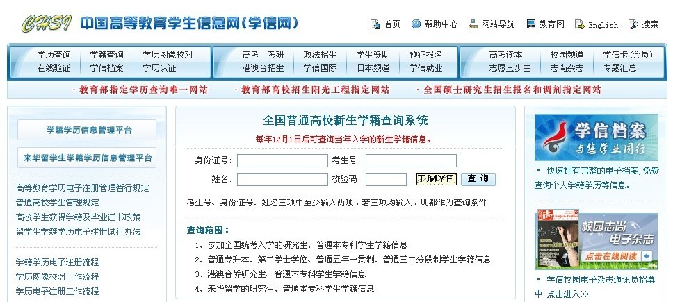 中国高等教育学生信息网(也称学信网,网址:http://www.chsi.com.cn)是我国高等学校新生注册、在校生学年注册、毕业生学历证书电子注册及相关查询唯一网站。