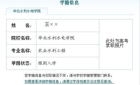 4、输入“身份证号”或“考生号”+ “姓名”+ “校验码”,即弹出学籍信息,包括个人相关信息和照片。“考生号”即学生录取当年的准考证号(共14位)。
