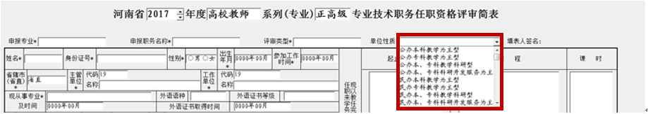 1、申报人登录“河南职称网”(www.hnzcw.gov.cn、www.hnzc.gov.cn),从“软件下载”栏中下载“河南省职称工作信息系统”个人版软件,一并下载最新的“个人版升级程序”和“数据字典更新代码”进行软件更新。并使用系统规范录入、打印的《评审简表》(A3纸张正反打印)一式3份,《评审简表》“单位性质”栏须显示申报的类别(如“公办本科教学为主型”、“公办本、专科教学科研型”或“公办本、专科科研开发服务为主型”)。