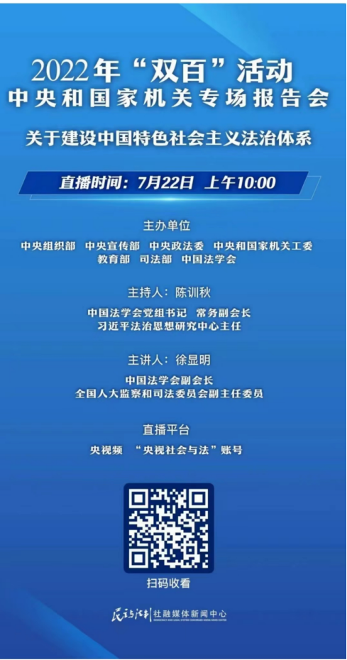 7月22日上午10时,中央组织部、中央宣传部、中央政法委、中央和国家机关工委、教育部、司法部、中国法学会联合举办“双百”2022年中央和国家机关专场报告会。中国法学会副会长、全国人大监察和司法委员会副主任委员徐显明作“坚持建设中国特色社会主义法治体系”宣讲报告。
