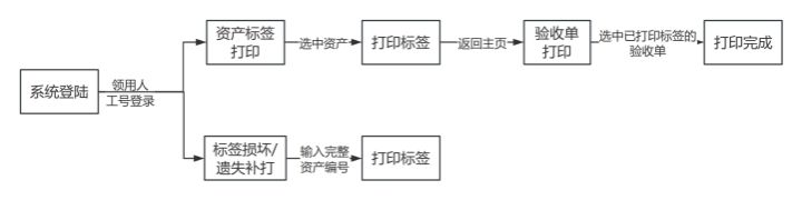 领用人通过工号登录,可以实现“资产标签打印”“验收单打印”及“标签损坏/遗失补打”功能。具体操作流程见下图。