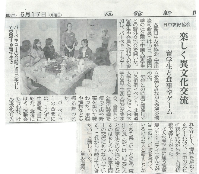 三名同学也受到当地日中友好协会的热情欢迎,并受邀参加户外交流活动,探讨中日文化的渊源,在不同文化间思想碰撞的同时,展示出我校学生的风采。此次活动还受到当地媒体的关注,相关报道于6月17日刊登在《函馆新闻(日报)》。