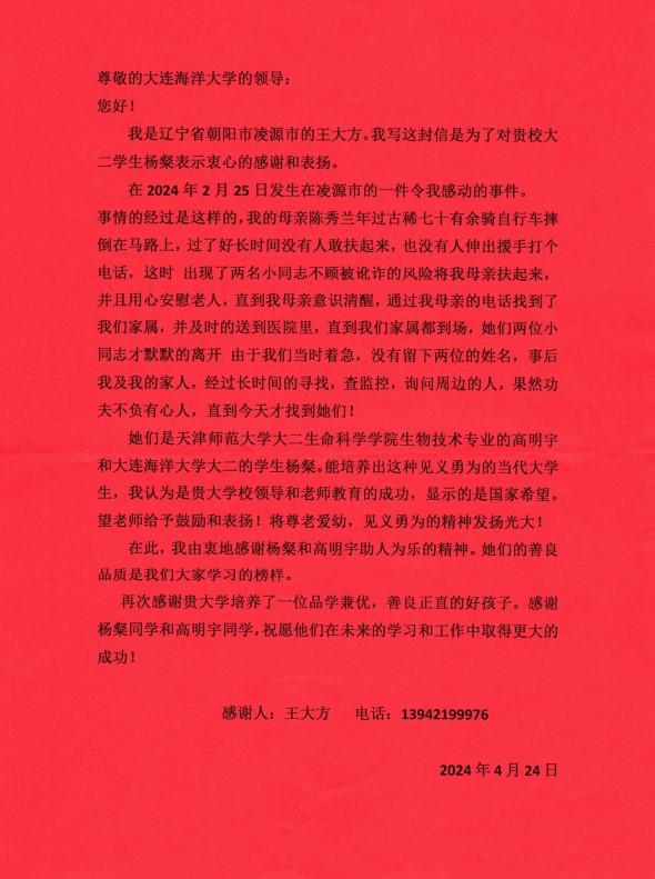 近日,我校收到辽宁省朝阳市辽源市市民王大方写给学校的感谢信,感谢我校williamhill食品科学与工程2022-3班本科生杨粲同学见义勇为的行为,感谢学校培养出优秀的学生。