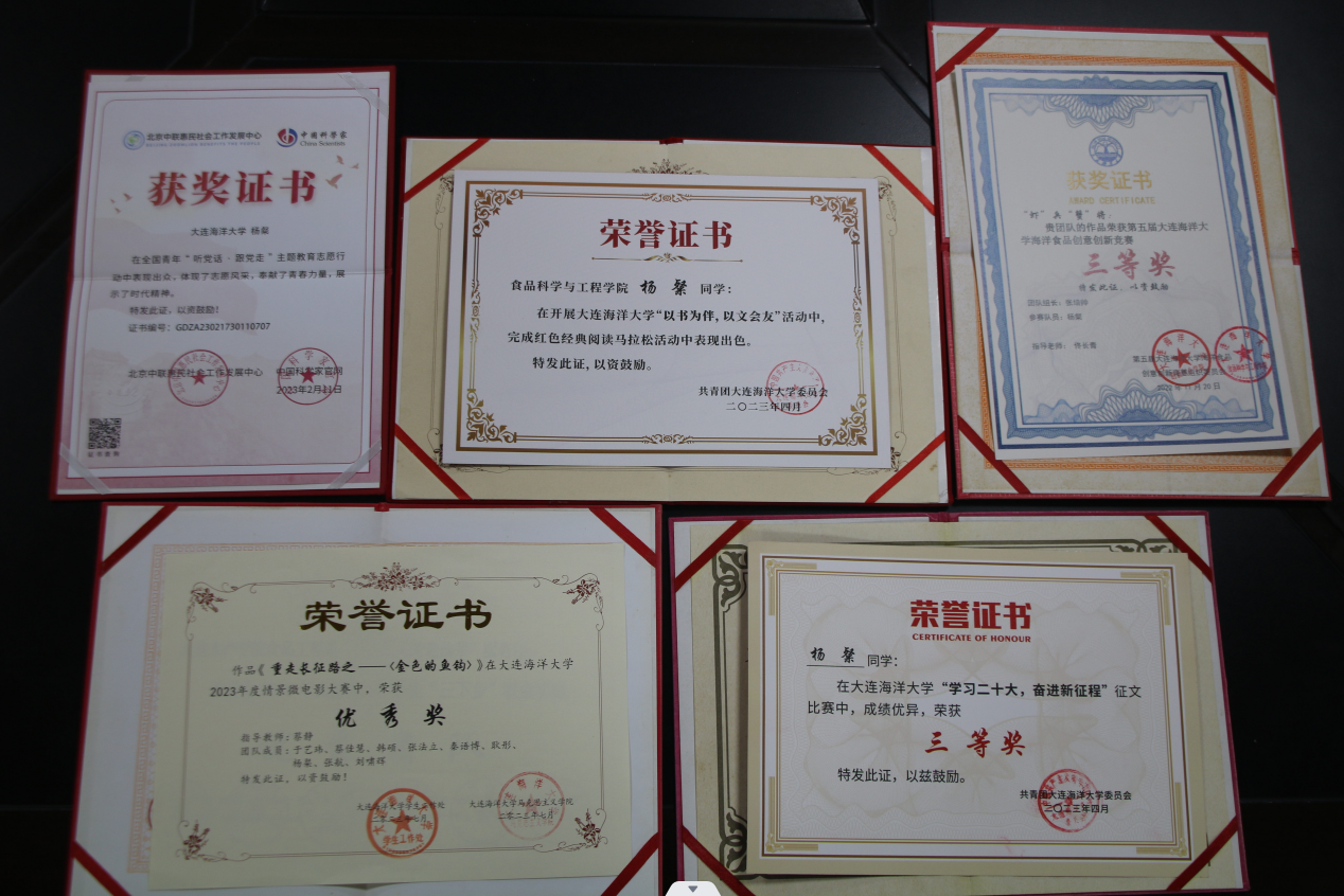 曾获得2022年辽宁省大学生食品创新大赛三等奖,2023年大连海洋大学“互联网+”大学生创新创业大赛二等奖,2023年大连海洋大学食品创新大赛优秀奖,2023年大连海洋大学“学习二十大,奋进新征程”征文比赛三等奖,2023年大连海洋大学第二届授课大赛优秀奖,辽宁省第二届大中小学师生书法大赛优秀奖等多项荣誉。