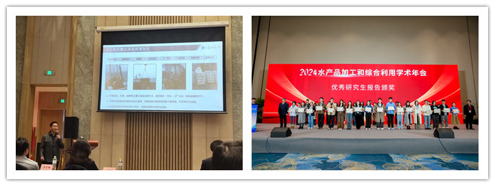 水产品加工和综合利用学术年会以“培育蓝色新质生产力,推动水产食品再提升”为主题,设置主旨报告、特邀报告、专题报告、研究生论坛等环节。田元勇副教授就“鱼贝类锁鲜与保鲜关键技术研究”主题作了专题报告,分享了鱼贝类锁鲜与保鲜的最新研究成果和实践经验。15名研究生在研究生论坛上作口头报告,李迪和王馥仪获得优秀报告二等奖。