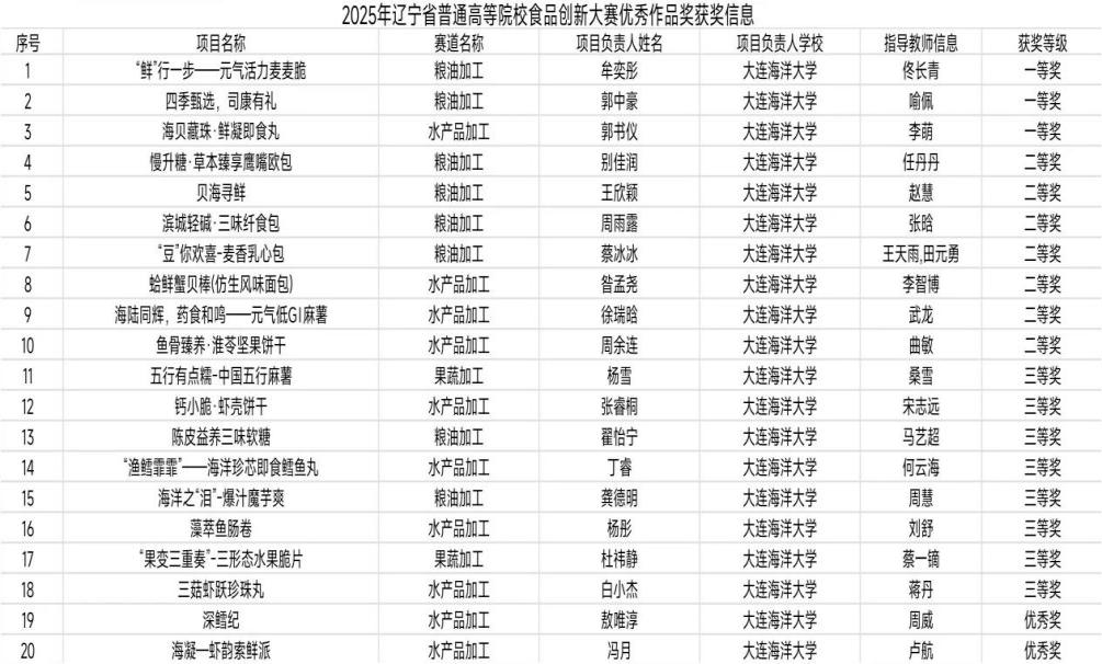 近日,由辽宁省教育厅主办,沈阳农业大学承办的2025年辽宁省普通高校食品创新大赛成功举办。我校共申报作品51项,入围25项,经过评选,获省一等奖3项,二等奖7项,三等奖8项。