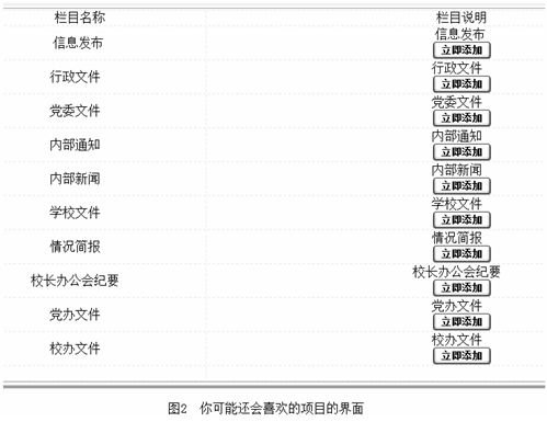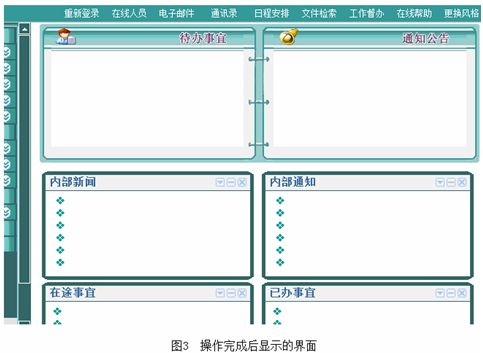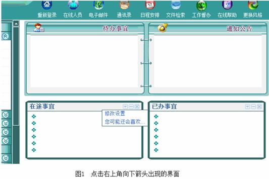 操作过程如下:用户进入办公信息平台会看到中间有四个窗口,其中“待办事宜”和“通知公告”为固定窗口,下面的“在途事宜”和“已办事宜”为活动窗口,可点击它们中的任一窗口的右上角的向下箭头图标(如图1所示),然后选择“你可能还会喜欢……”选项,出现的界面如图2所示,选择添加“内部新闻”和“内部通知”两个窗口即可,回到主界面后重新登录或点击右上角的刷新按钮后完成操作出现图3所示界面。