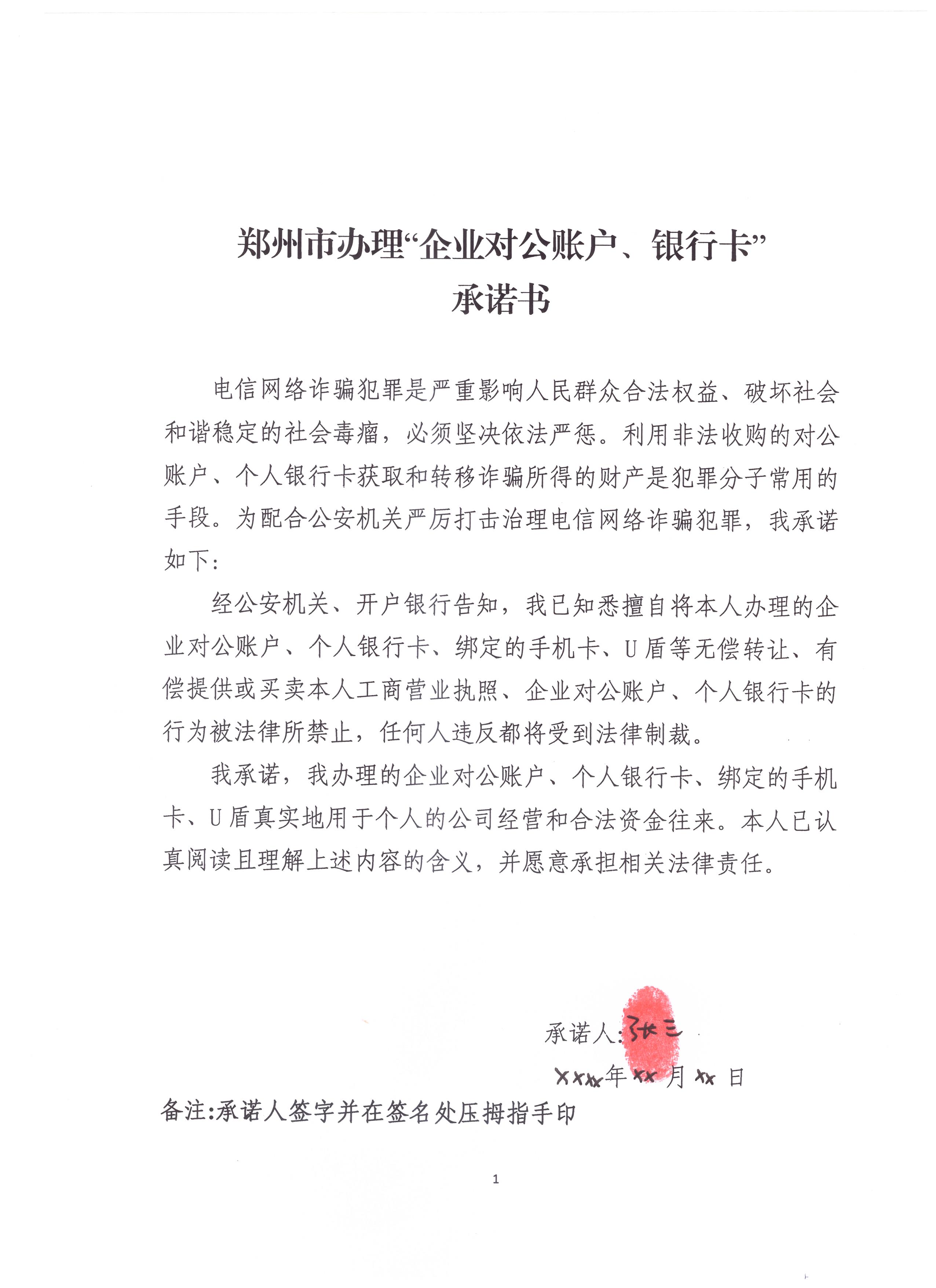 (四)按照附件3-1文件模板填写郑州市办理“企业对公账户、银行卡”承诺书(附件3)。