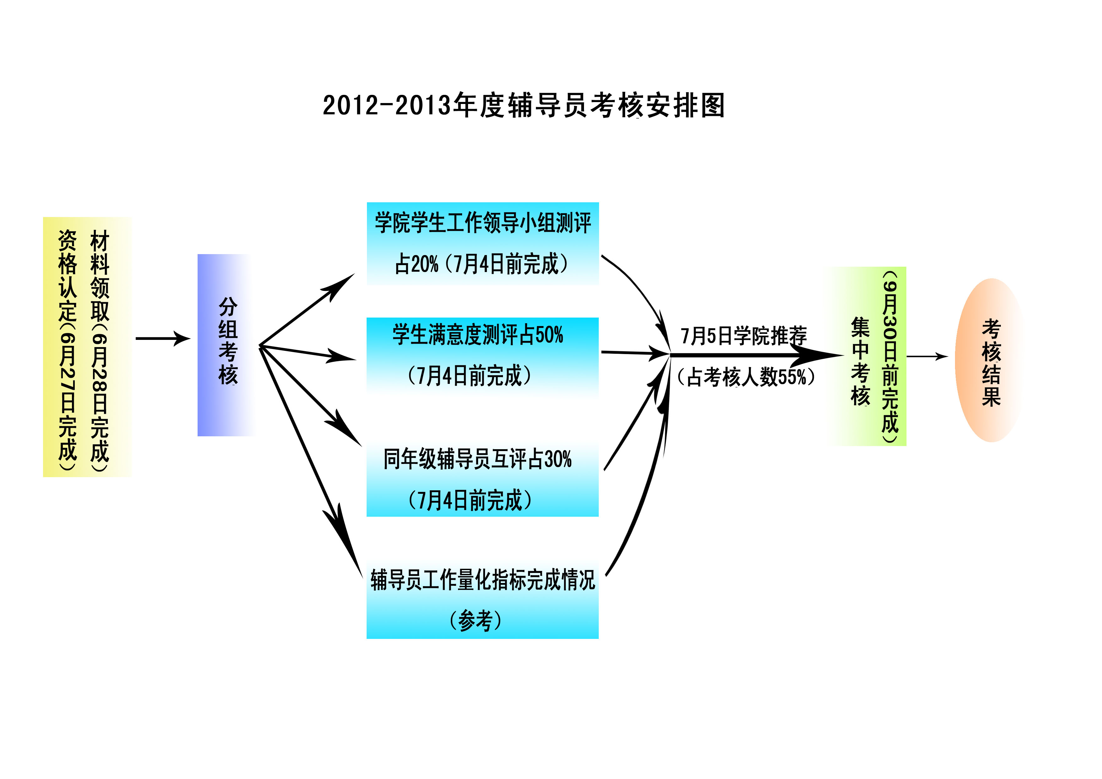 为加强辅导员队伍建设,全面、准确评价辅导员的思想作风和工作业绩,根据学校总体工作安排,按照客观公正与注重实绩相结合、定性与定量相结合、工作过程与目标导向相结合、工作总体情况和关键环节相结合的原则开展辅导员考核工作,现将2012-2013学年辅导员考核评优工作安排如下: