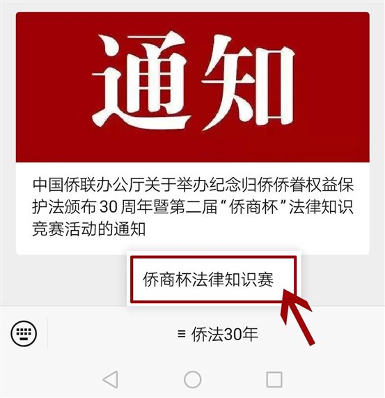 (一)第二届“侨商杯”法律知识竞赛参赛方式:关注“中国侨联普法办”微信公众号,在中国侨联普法办微信公众号(二维码见附件)下方点击“侨商杯法律知识赛”进入答题页面进行答题;中国侨联微信公众号、中国普法微信公众号、中国侨联官网、中国侨网、中国普法网、中国法制网等网站及新媒体上同步设置答题活动logo,也可跳转进入中国侨联普法办微信公众号进行答题。
