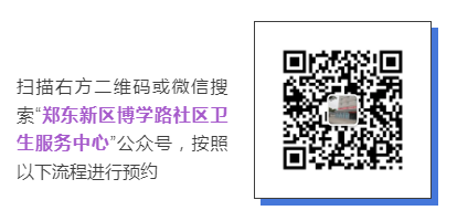 二、疫苗预约:微信搜索“郑东新区博学路社区卫生服务中心”公众号或者扫描下方二维码进行预约(预约不便者可直接来校医院接种)