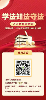 知法普法与法治建设需要每位国民身体力行,大家务必重视学习!后台会生成各校参与人数并上报,大家以各自扫码方式进入观看并获取证书,各学院、书院做好人数统计,确保全员参与。